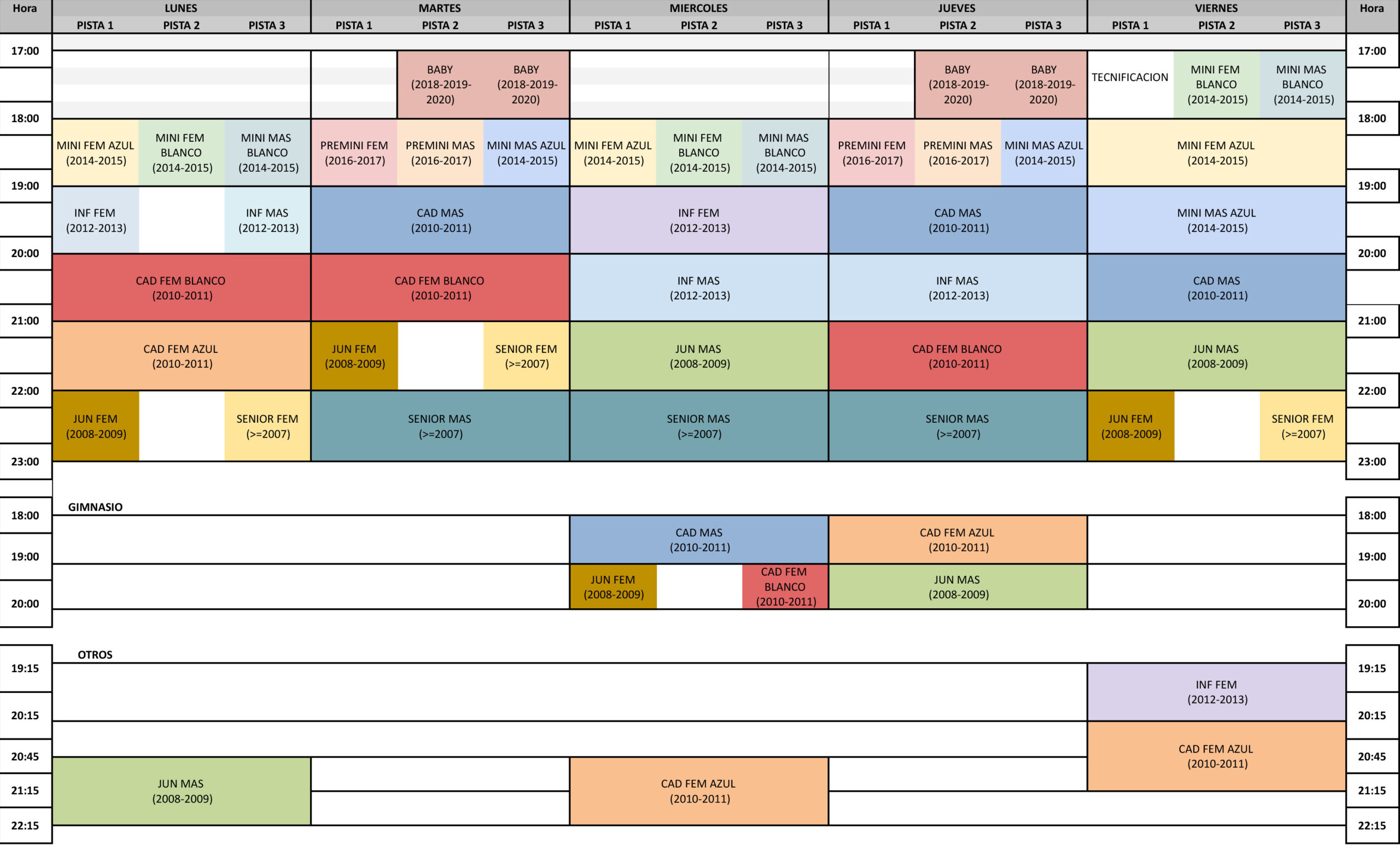 Con la excepción de los Baby, los entrenamientos comenzarán 15 minutos antes (calentamiento) y finalizarán 15 minutos después  (estiramiento), más la ducha.